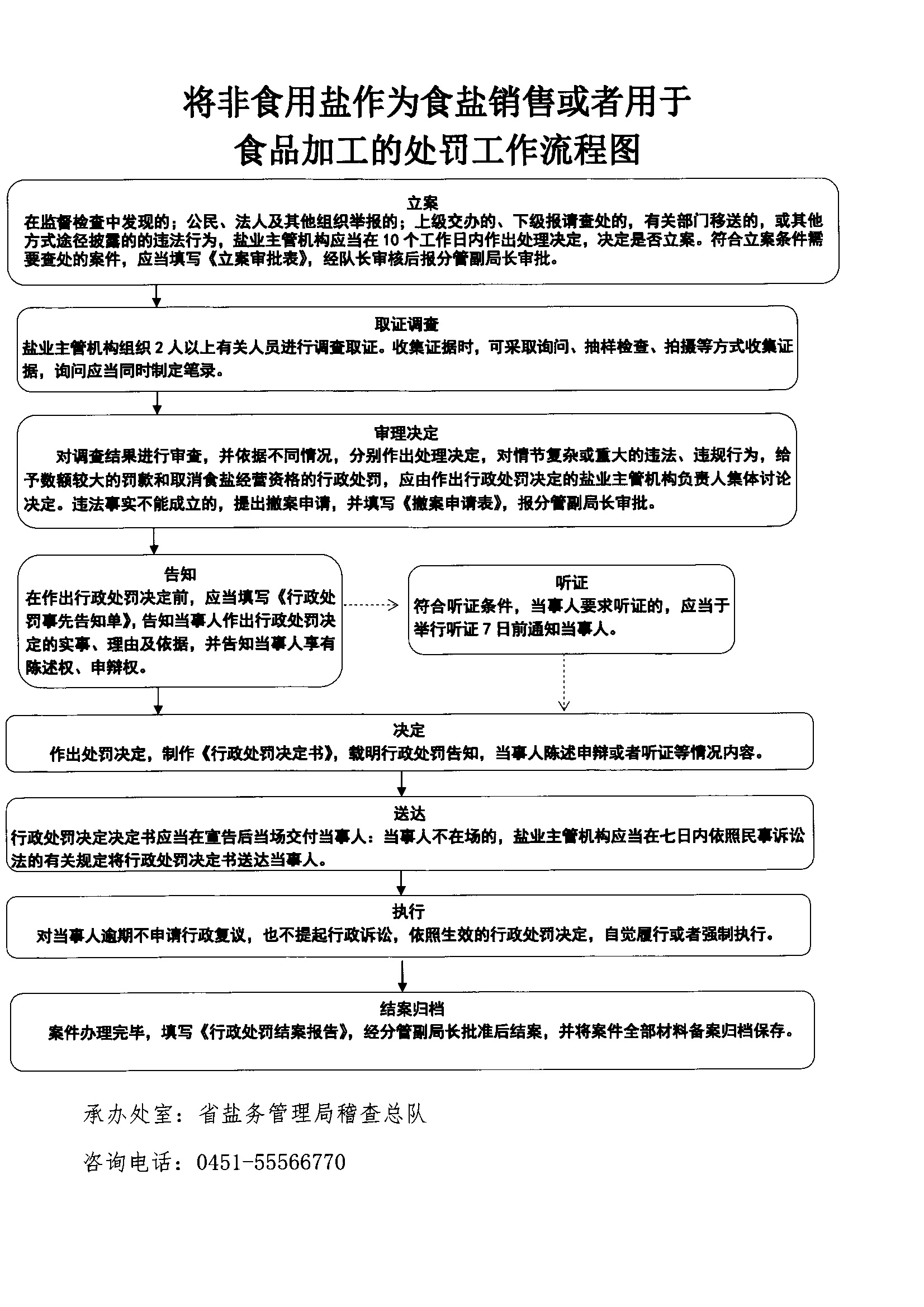 | 办理条件 | 当检查中发现将非食用盐作为食盐销售或者用于食品加工情况时,启动行政处罚。 | ||||